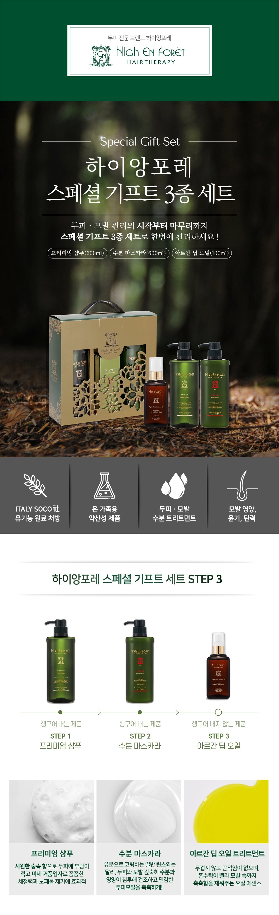 프리미엄 샴푸 600ml / 수분 마스카라 600ml / 아르간 딥 오일 100ml