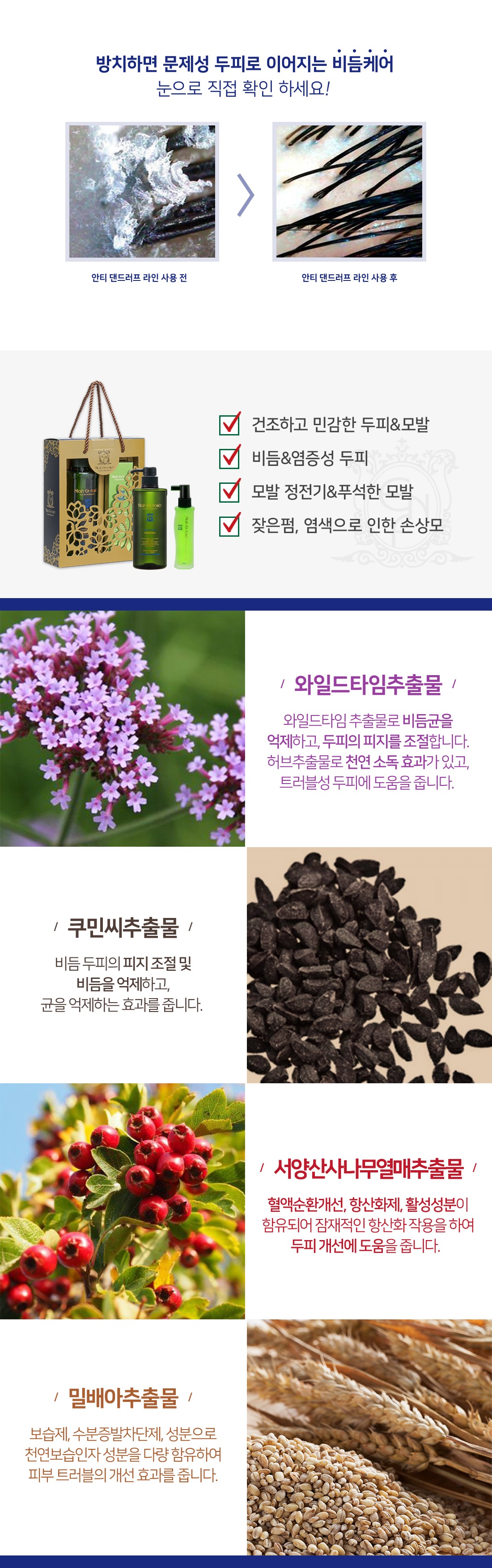 와일드타임추출물과 이리칼민 활성성분이 함유되어 비듬에 효과적이고 두피 및 모발을 청결히하며, 적절한 수분을 유지시켜 건강하게 하여줍니다.